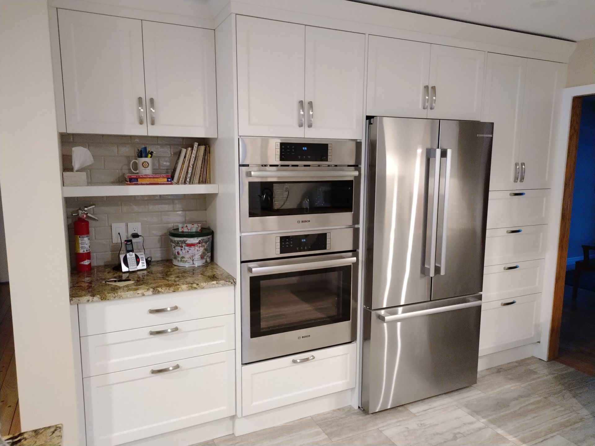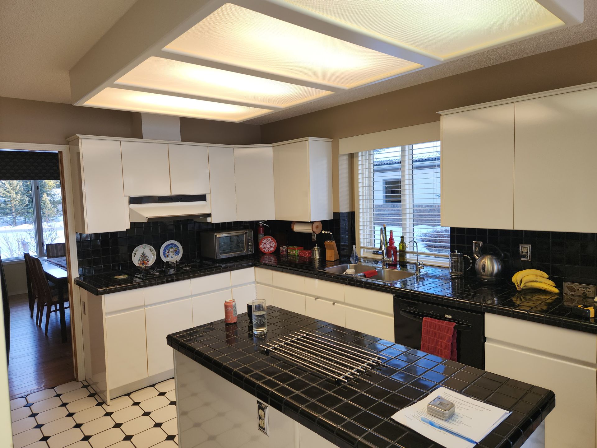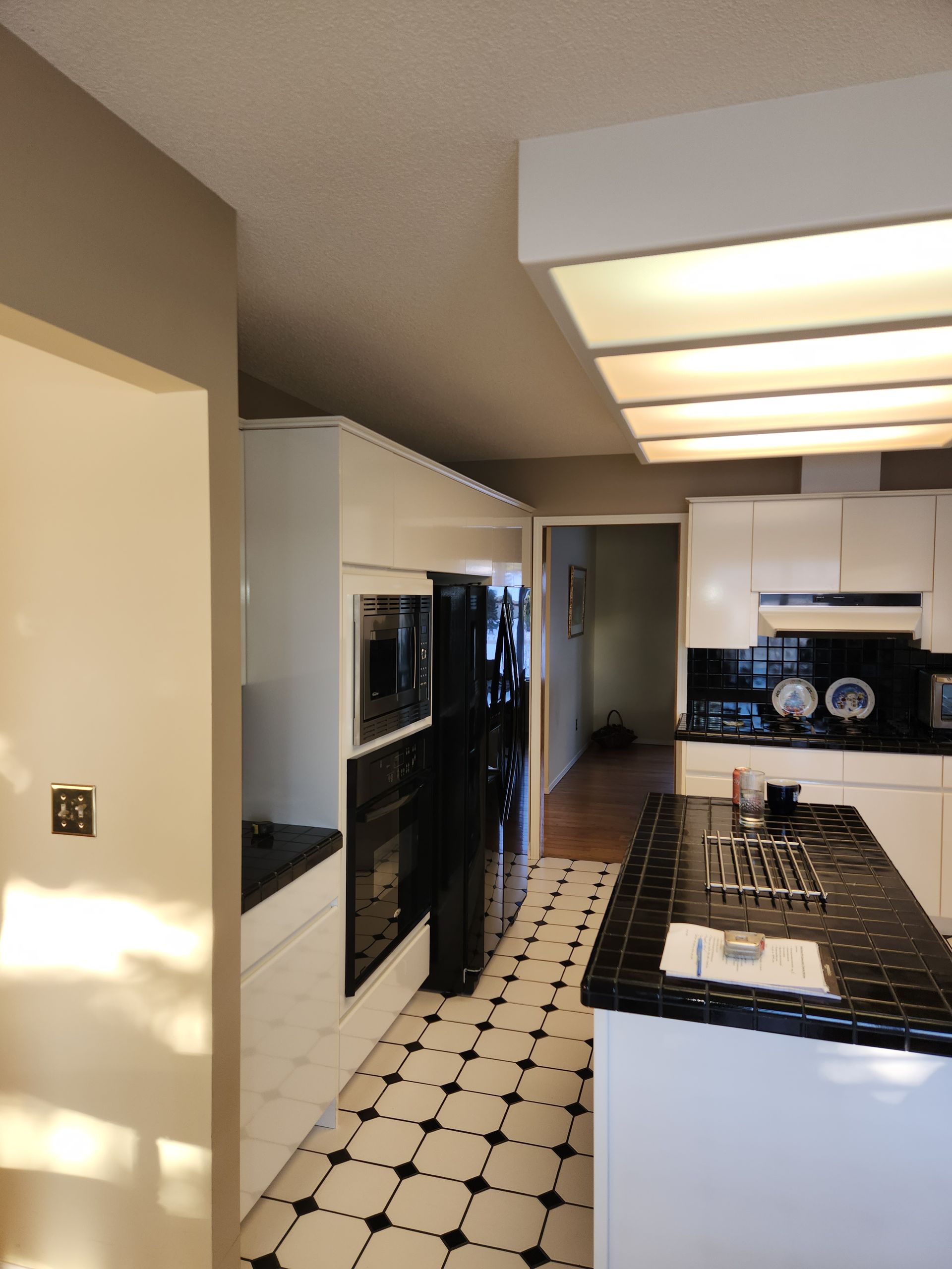 Nice update to a dated kitchen, removed the undersized island for a more practical peninsula layout, opened up the nook to family room, refinished hardwood and painted
